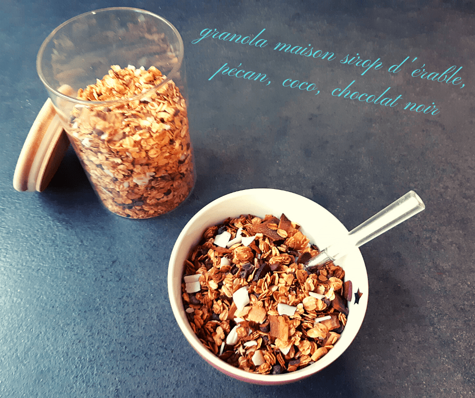 Il en existe de nombreuses sortes dans le commerce mais c’est tellement mieux de faire son granola du petit-déjeuner soit même. On peut y mettre ce qu’on a envie et en plus c’est rapide et facile à faire ! Pour cette version, j’ai décidé d’associer la noix de coco au chocolat noir et à la noix de pécan. Un peu de sirop d’érable pour lier l’ensemble et on peut se faire un bon petit-déjeuner équilibré !