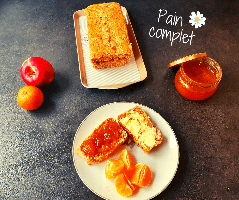 Idéal, pour le matin, avec du beurre ou de la confiture. Cette recette vous donne un bon pain complet, sain, en très peu de temps puisqu’il nécessite qu’une heure de pousse… et pas besoin de machine à pain !