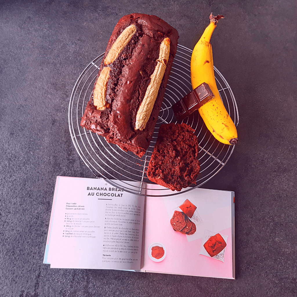 J’ai acheté un petit livre de recettes spécial banana bread et ce cake est le premier du livre que je teste. Verdict ? Un cake puissant en chocolat puisque dans la pâte il y a à la fois du cacao amer et du chocolat noir. Il faut attendre le lendemain pour le manger, selon moi, car l’amertume du cacao est moins importante. On peut, aussi, réduire la dose de cacao dans la préparation, ce que j’ai fait !