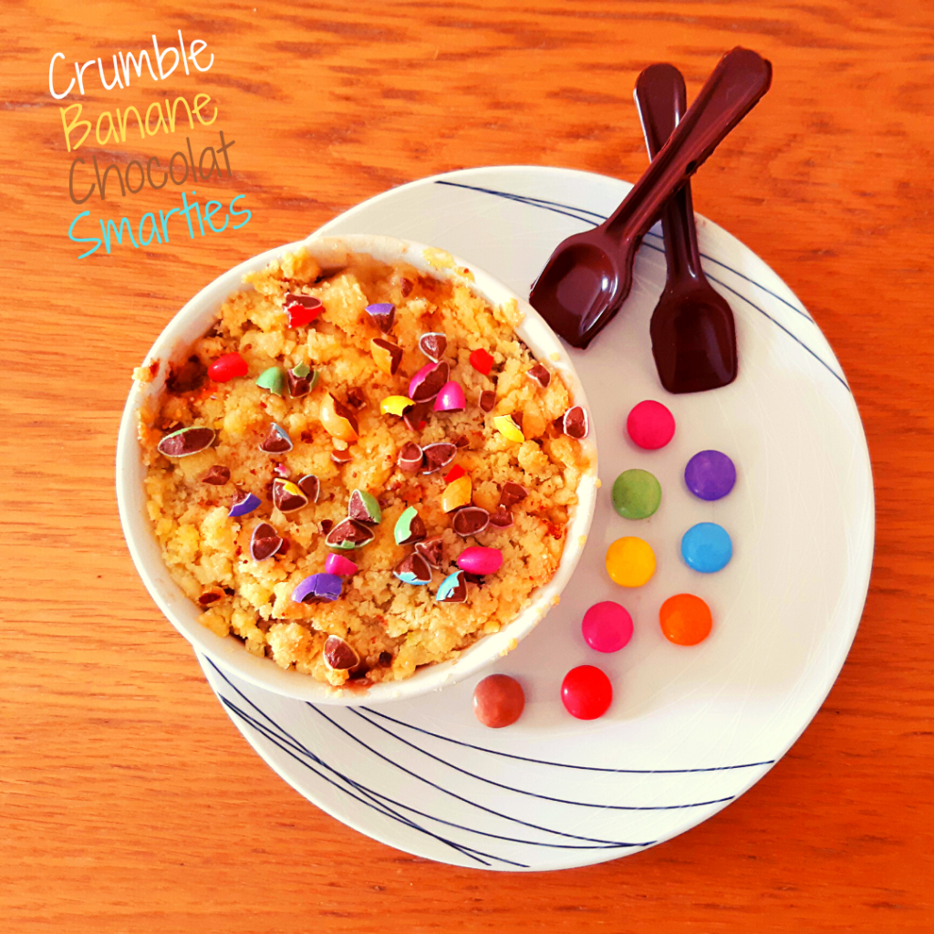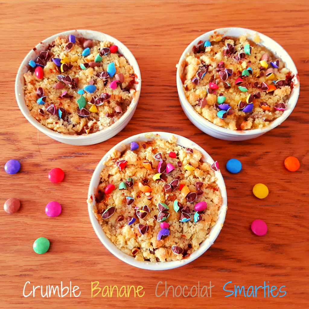 J’adore les crumbles ! On peut en faire avec n’importe quel fruit de saison et y rajouter de la gourmandise avec du chocolat, du spéculoos ou comme ici des SMARTIES®. Je vous propose des petits crumbles individuels simples à réaliser mais terriblement gourmands. La banane se marie très bien avec le chocolat au lait et les SMARTIES® pour un petit retour en enfance 🙂