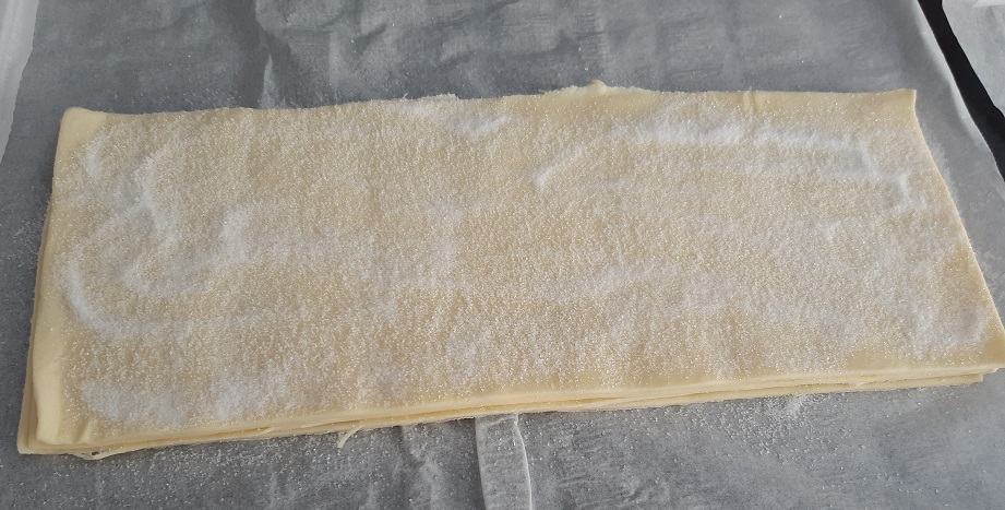 Posez une des 4 bandes sur du papier cuisson. Saupoudrez de sucre.