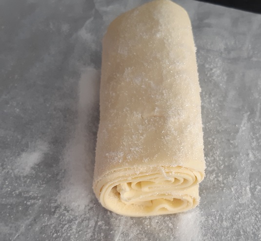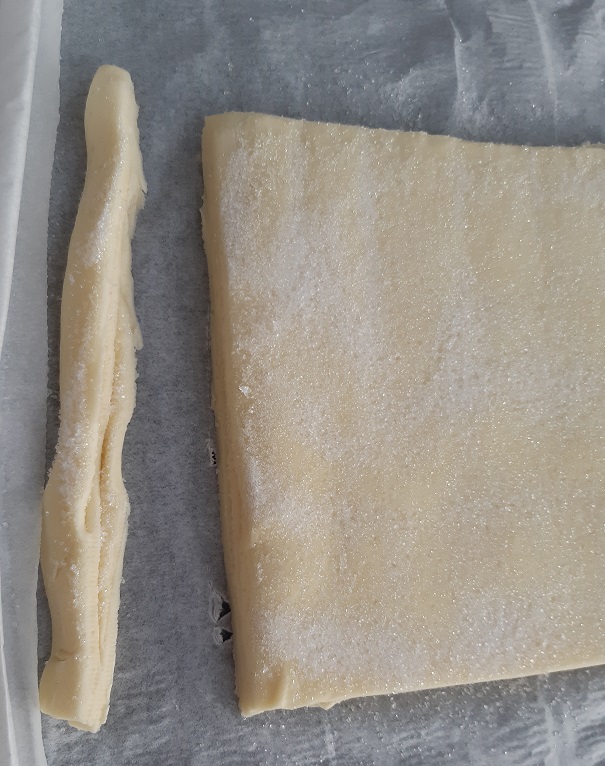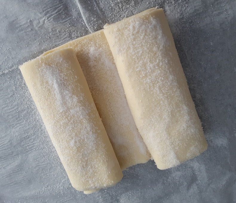 Un peu de calcul maintenant 🙂 Mesurez toute la longueur de votre bande et divisez cette longueur en 6. Repliez, alors, un côté sur cette mesure. Faites de même avec l’autre côté. Renouvelez l’opération en repliant chaque côté sur lui-même. Les 2 extrémités doivent se rejoindre au centre mais en laissant un espace vide de quelques centimètres. Saupoudrez bien de sucre en poudre.