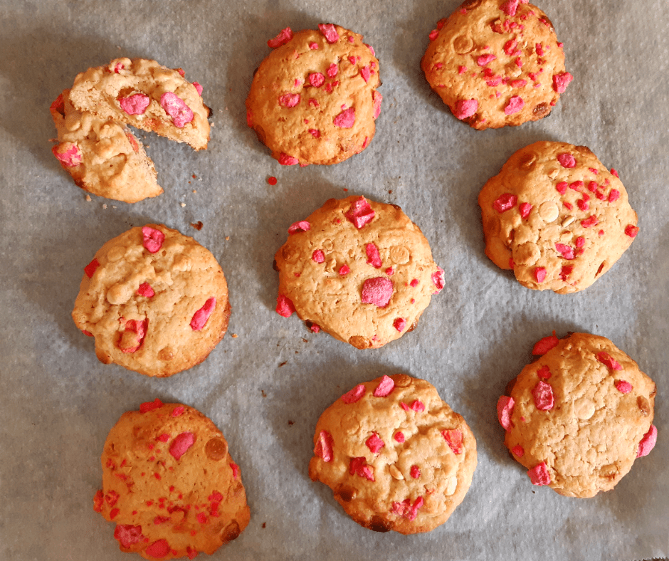 J’adore faire des cookies, j’y prends beaucoup de plaisir surtout quand il fait froid et qu’il pleut… Mais surtout j’adore les manger 🙂 Pour cette version, j’ai associé le chocolat blanc avec les pralines roses, ça fonctionne très bien ensemble ! Vous pouvez remplacer une partie de la farine par de la noix de coco râpée, ça fonctionne aussi très bien en terme de saveurs.