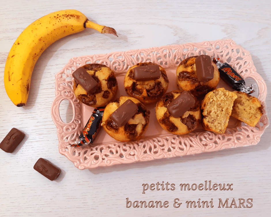J’avais, dans mes stocks, un paquet de MARS MINIS. J’ai eu envie de réaliser une petite douceur qui associerait la banane à ces barres chocolat-caramel. Et quoi de mieux pour le goûter du week-end que des petits moelleux faciles à transporter et à manger !? Les MARS rajoutent une touche chocolat-caramel à ces petits moelleux au bon goût de banane 🙂 J’ai beaucoup aimé !