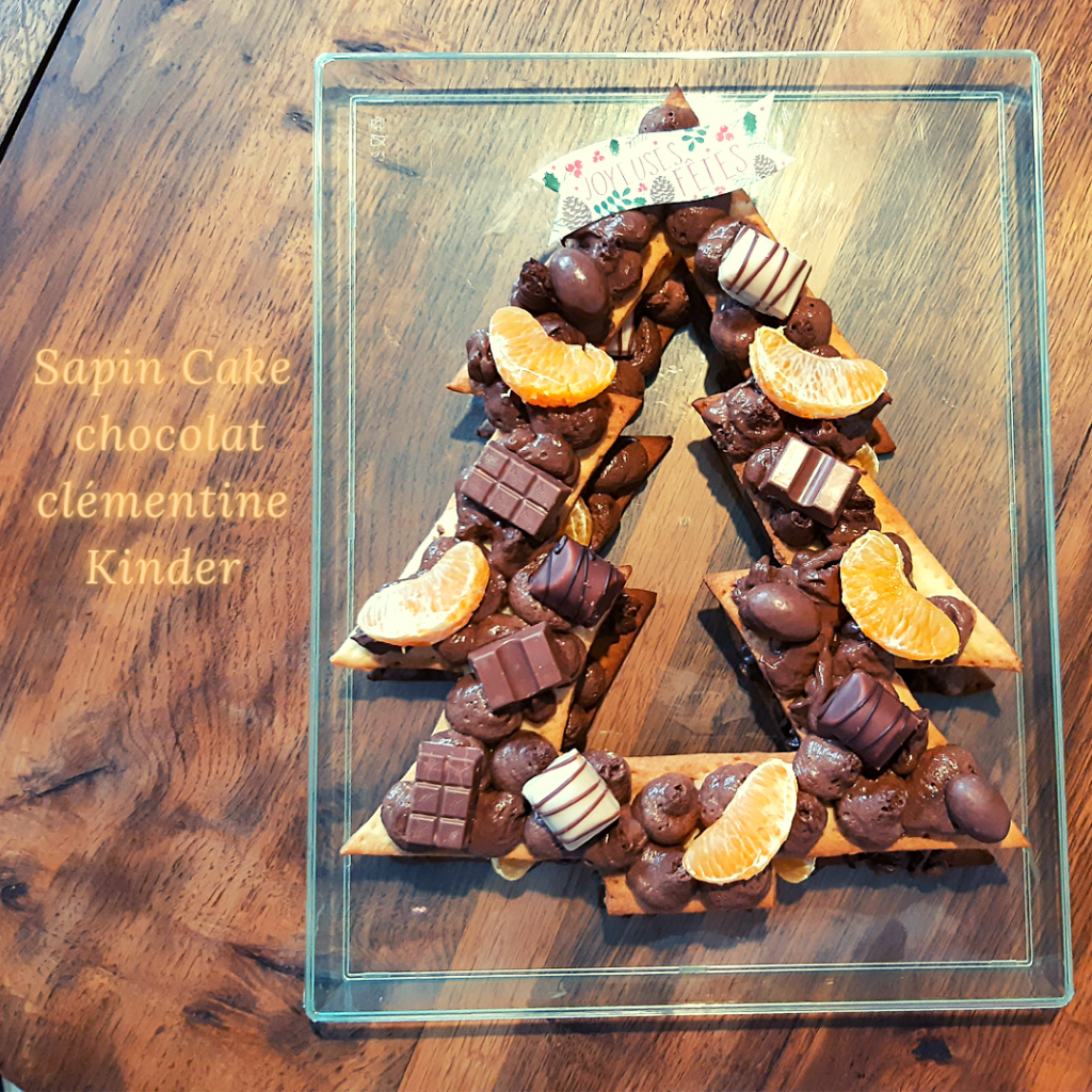 Préparez tous les éléments pour avoir tout à portée de mains (clémentines, décorations de Noel…). Sortez la mousse et mettez-la dans une poche à douille munie d’une douille unie ou cannelée. Posez le 1er gabarit sapin sur le plat de service. Pochez la mousse sur deux rangées. Ajoutez quelques clémentines, chocolats… Posez le 2nd sapin par-dessus et pochez le reste de mousse. Décorez de clémentines, mini KINDER, papillotes… Attention à ne pas en mettre de trop sinon la pâte peut se casser et le sapin cake sera trop bourratif. Vous pouvez aussi décorer le plat de service pour que chacun picore selon ses envies sucrées.