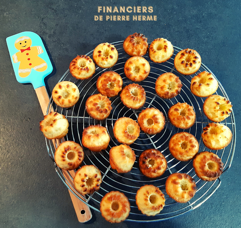 Il n’y avait pas encore de recette de financiers sur mon site… c’est chose faite 🙂 J’ai testé la recette de Pierre HERME et, bien évidemment, c’est une très bonne recette de financiers ! Ils ont eu beaucoup de succès auprès de mes collègues qui les ont dévorés très vite ! L’utilisation de ces mini moules à kouglof permet d’avoir des financiers à la fois moelleux et croustillants !