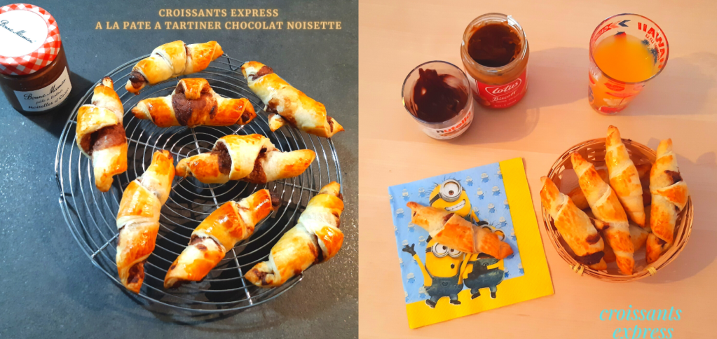 Une recette simple, facile et gourmande ! Les croissants express sont tops pour le petit déjeuner du week-end ! Vous pouvez varier le fourrage : Nutella ou autre pâte à tartiner chocolat-noisette, pâte de spéculoos… Des viennoiseries minutes que j’ai réalisé pour mon pot de départ au boulot. Les collègues ont bien apprécié 🙂