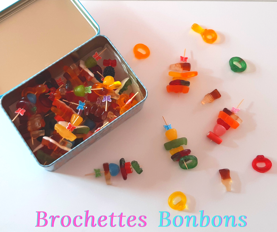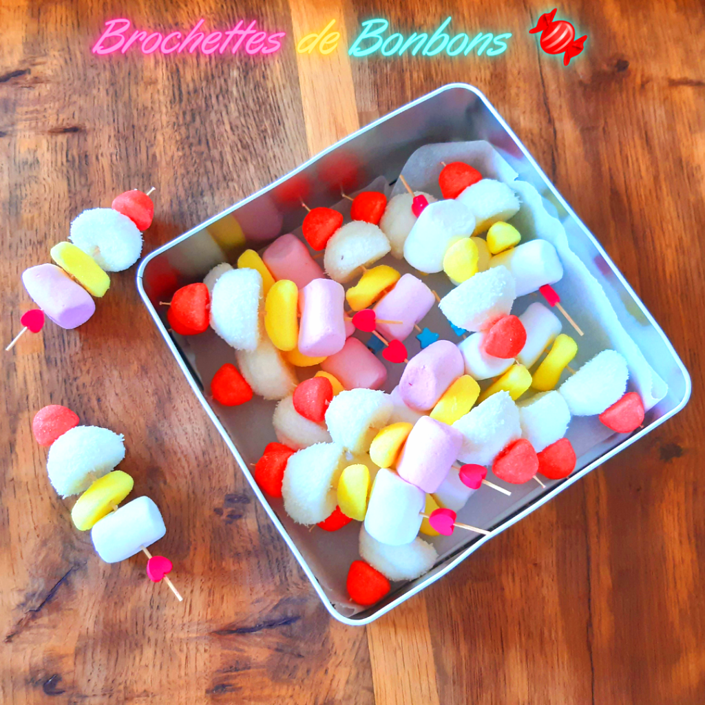 - brochettes de bonbons : guimauves – fraises TAGADA – bananes BAMS (comme sur ma photo) ou crocodiles – Schtroumpfs – Happy Cola – Dragibus