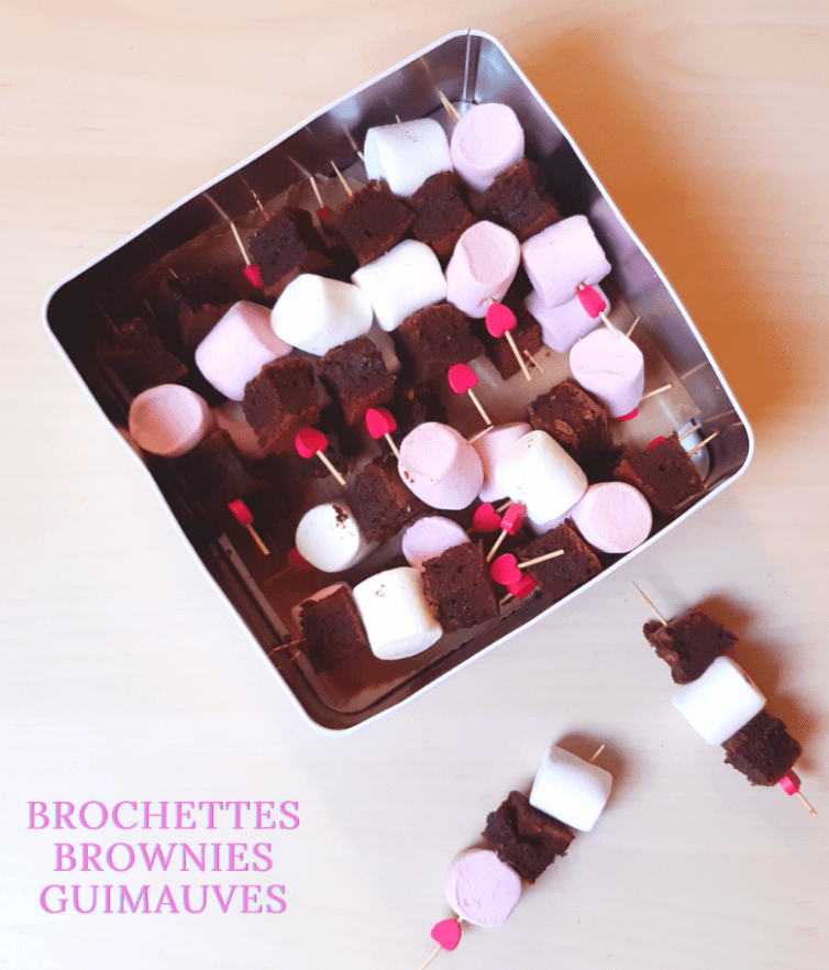 - brochettes gourmandes : gaufres – brownie ou guimauves – brownie