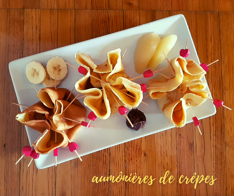 Les crêpes, c’est un grand classique pour un dessert gourmand, facile et rapide à faire. On peut les revisiter, un peu, en les mangeant sous forme d’aumônières ! A vous de les garnir selon vos envies : banane – Nutella, framboise – Spéculoos, poire – caramel …