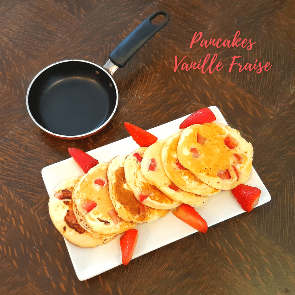 Une recette de petit déjeuner idéale pour l’été ! Les pancakes ont un bon goût de vanille et les généreux morceaux de fraises rajoutent de la fraicheur et de la gourmandise. La recette de base est celle de Martha Stewart, très célèbre pour ses recettes aux Etats-Unis.