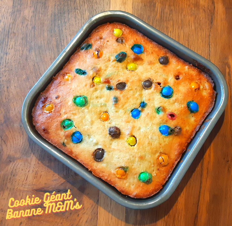 Un cookie gourmand à partager, ça vous tente 😉 ? Pour une fois, j’avais envie d’un cookie carré 🙂 mais vous pouvez très bien le faire dans un moule rond. L’association banane – M&M’s fonctionne nickel ! Vous obtiendrez un cookie moelleux et non croquant puisqu’on a ajouté de la banane à la préparation.