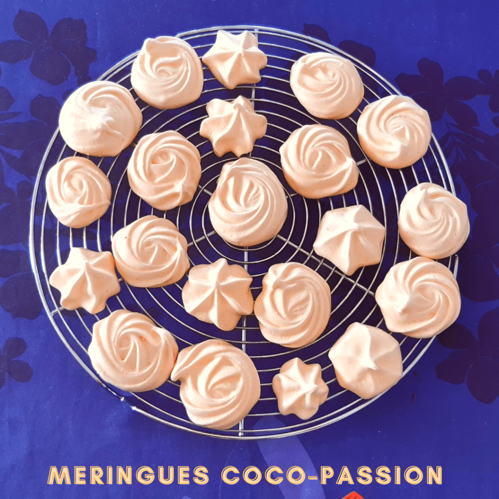 Et oui encore des meringues 😉 Mais une version encore différente 🙂 J’avais reçu des baby pots de sucre aromatisé noix de coco et passion. J’ai eu l’idée de les associer dans des meringues… et le résultat a été satisfaisant 😉 Les meringues ont vite été mangées !!!