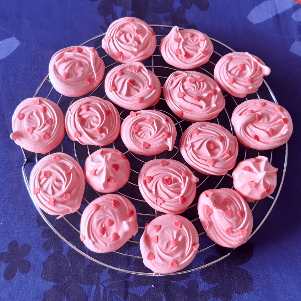 Enfournez, immédiatement, pour 2h. Si on réalise deux plaques, il est primordial de les cuire en même temps. Pendant la cuisson, toutes les 30 minutes, ouvrez la porte du four quelques secondes pour évacuer l’humidité. Les meringues sont cuites quand elles se décollent sans difficulté du papier cuisson. Si elles ne se décollent pas, prolonger la cuisson. Je vous conseille d’en tester une pour vérifier si la cuisson vous convient. Certains les préfèrent bien croquantes, d’autres, comme ma famille, encore fondantes à l’intérieur. Vous devez, donc, adapter la cuisson à vos envies 🙂