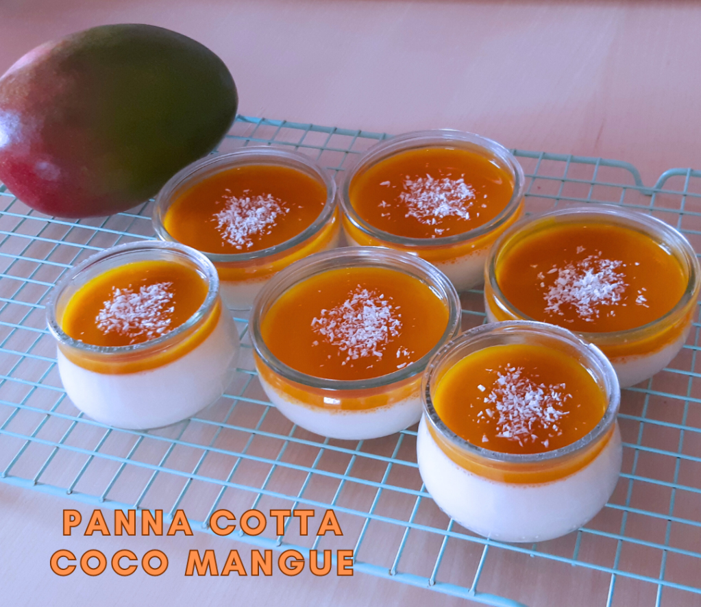 Toute 1ère recette de panna cotta que je vous propose ! Heureusement que mon chéri est là pour me rappeler mes manquements 😉 Je vous propose une version exotique avec une belle association de saveurs : la mangue et la noix de coco ! La panna cotta est très simple à faire alors lancez-vous 😉