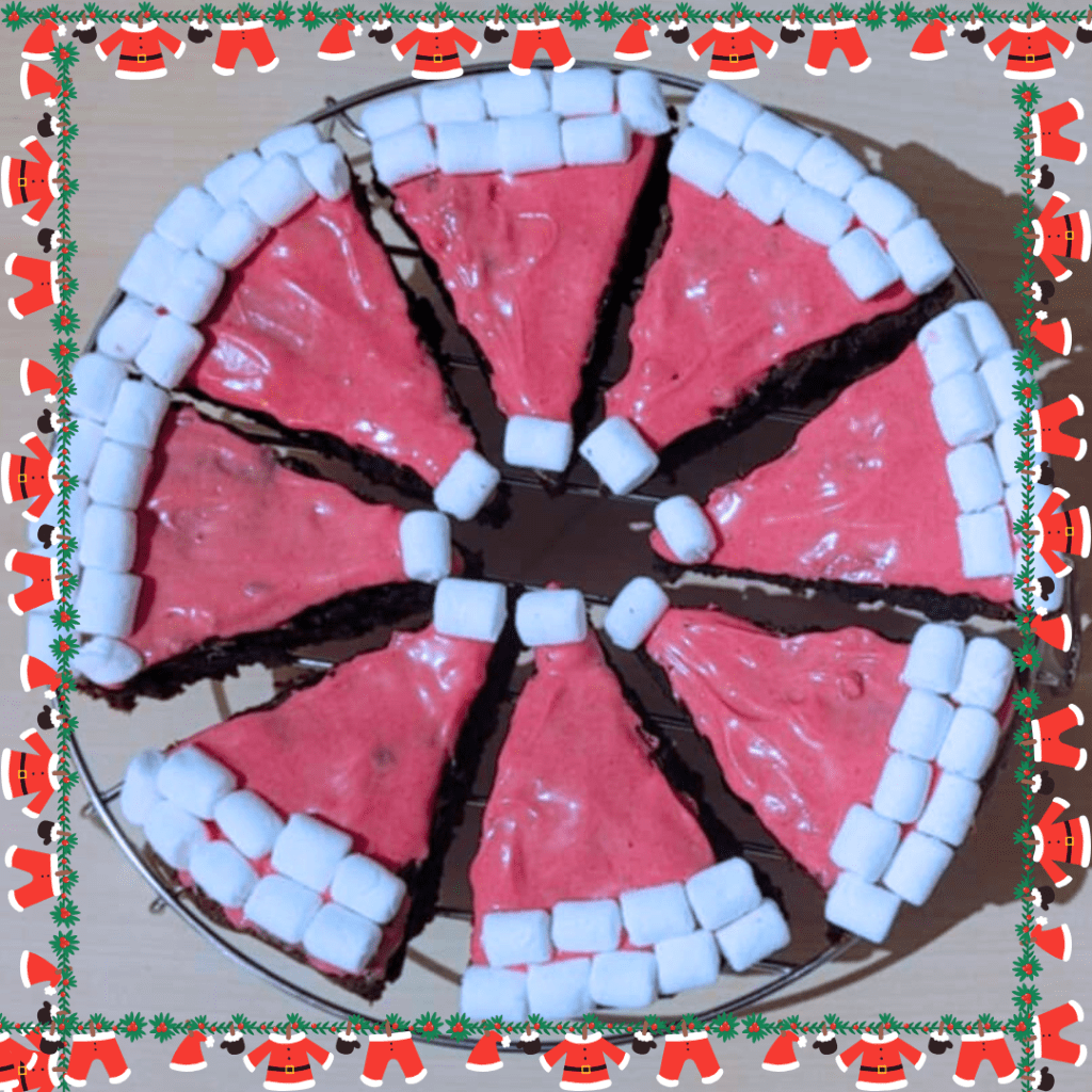 Coupez votre brownie en 8 parts égales. Pour chaque « bonnet », nappez de chocolat blanc fondu, coloré au préalable avec du colorant rouge. Ajoutez des mini guimauves pour faire la base du bonnet et le pompon.