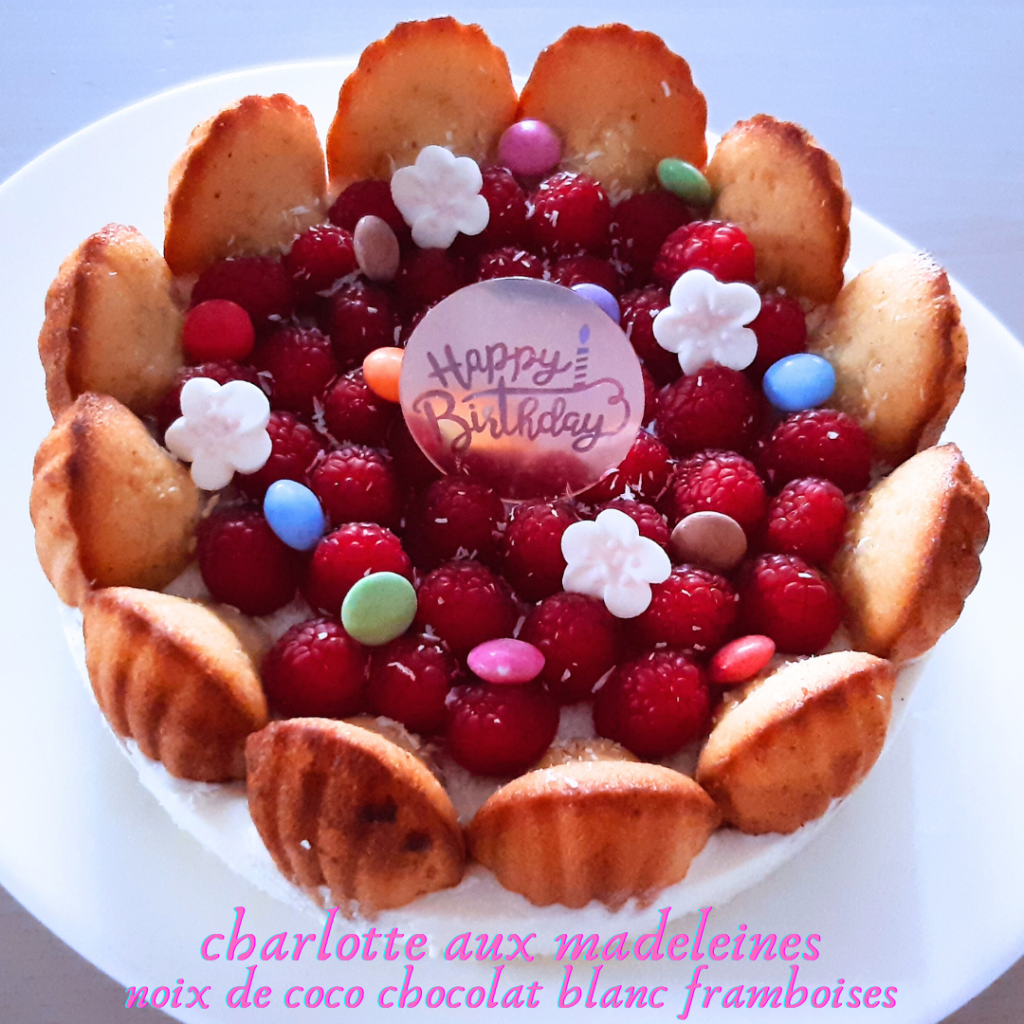 J’ai imaginé cette charlotte aux madeleines pour un anniversaire ! Elle est plutôt simple à réaliser alors n’hésitez pas à la tester et à adapter la recette à vos envies (mousse au chocolat, autres fruits…) ! Elle se compose de madeleines, d’une mousse chocolat blanc-noix de coco et de framboises !