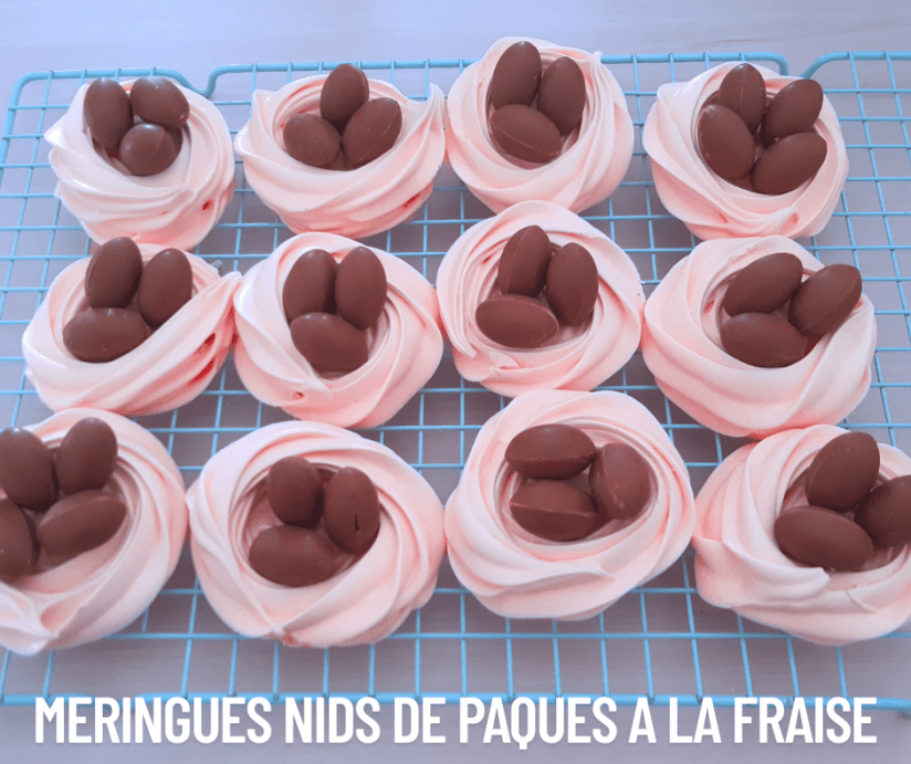 J’avais déjà réalisé, il y a 3 ans, des meringues de pâques garnies de petits œufs colorés en sucre : https://patisseriesdechoupie.com/2022/04/02/meringues-de-paques/ ! Cette année, je fais la version chocolat pour encore plus de gourmandise 😉 La meringue est, elle, à la fraise ! Le goûter idéal pour le week-end de Pâques 🙂