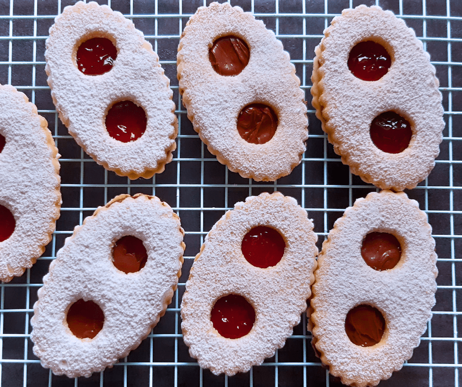 Saupoudrez les sablés ajourés (le dessus) de sucre glace. Garnir les sablés entiers (du dessous) avec de la confiture, de la pâte de spéculoos, du nutella… puis posez les sablés ajourés dessus.
