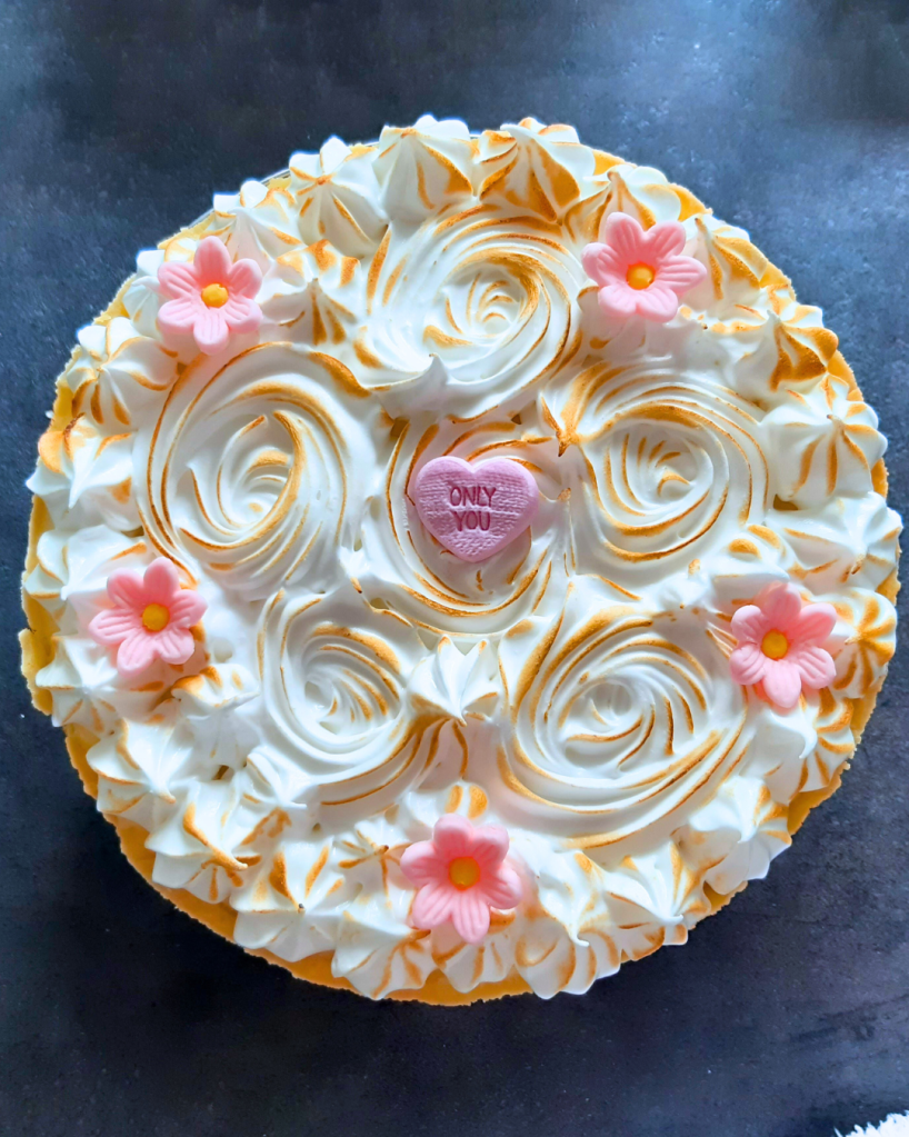 Répartissez la préparation dans une poche munie d’une douille étoilée/cannelée/rose puis décorez, de suite, joliment votre tarte. Passez un coup de chalumeau sur votre meringue.