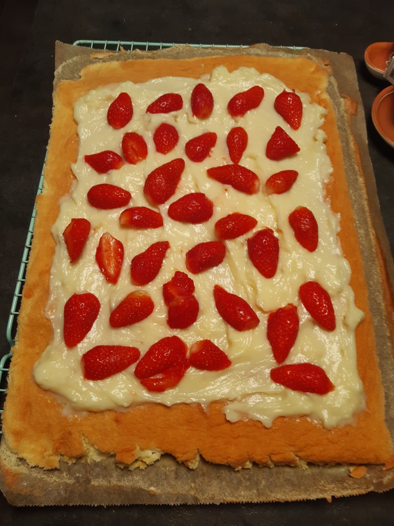 Répartir la crème pâtissière sur le biscuit viennois, disposez les fraises découpées puis rouler délicatement le biscuit !