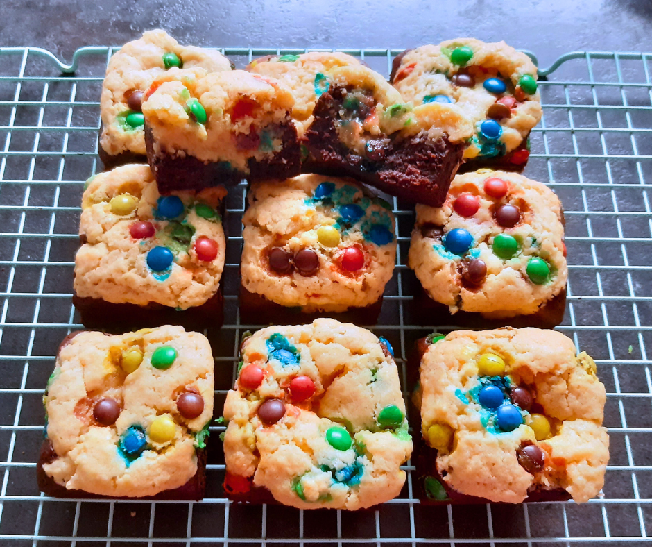 Rajoutez quelques M&M’s sur le dessus de votre brookie puis enfournez pour environ 30mn à 180°. La couche de cookie doit être bien dorée. Surveillez bien la cuisson.
