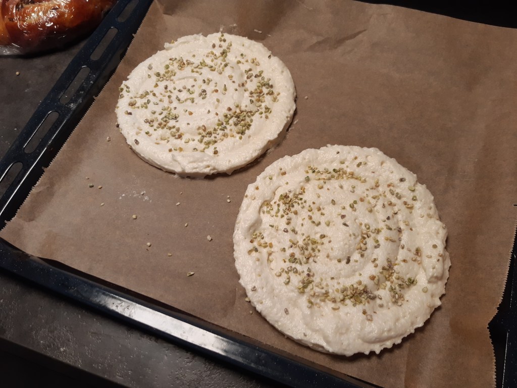 À l’aide d’une poche et d’une douille unie, dresser 2 fonds en spirale de 18-20 cm de diamètre. Parsemer les fonds de pistaches concassées.