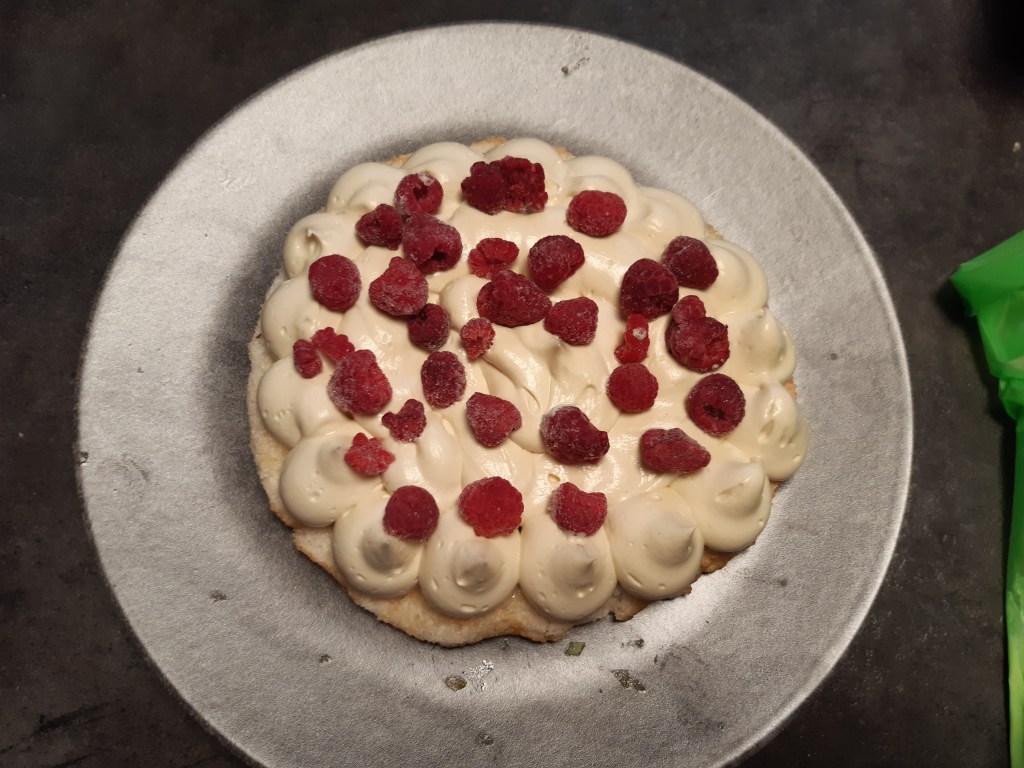 Pocher harmonieusement la crème au beurre sur le premier disque à l’aide d’une poche à douille. Ajouter les framboises. Et recouvrir du second disque. Finir en saupoudrant de sucre glace. Si il vous reste de la crème, vous pouvez la pocher sur le dessus de l’entremet et rajouter des framboises.
