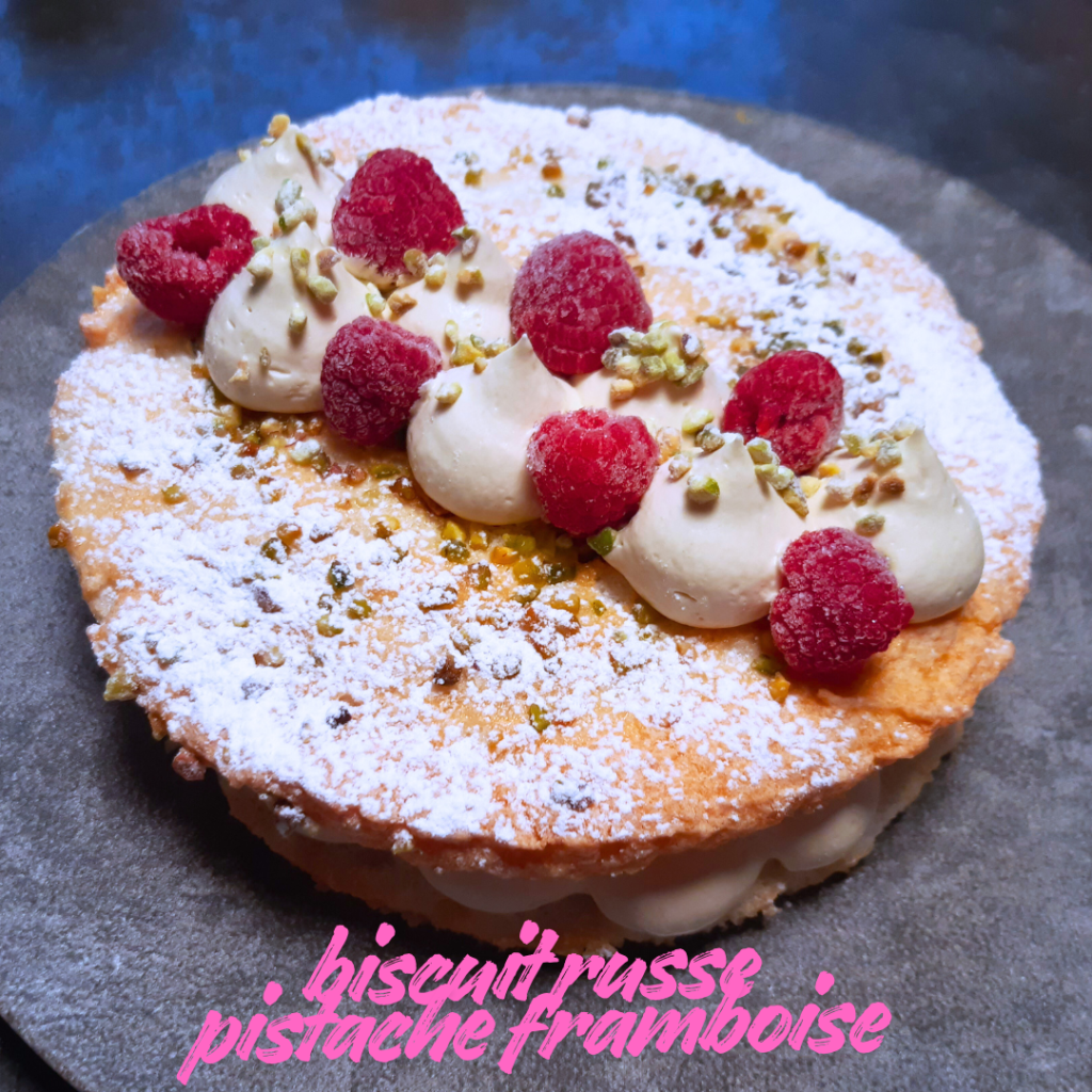 Le biscuit russe est un gâteau aromatisé à la pistache et fait partie des recettes du CAP pâtissier. J’ai rajouté des framboises qui s’associent parfaitement avec la saveur de la pistache ! Ce gâteau n’a pas fait long feu 😉 !!!