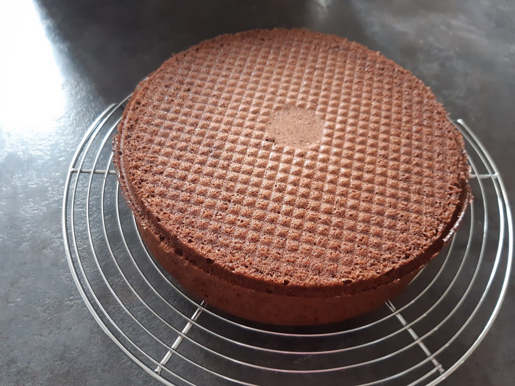 Dresser à la poche à douille 3 disques de génoise de 18-20cm de diamètre sur une plaque recouverte de papier cuisson. La génoise peut aussi être cuite dans un moule à manqué. Il faudra couper la génoise en 3 par la suite.