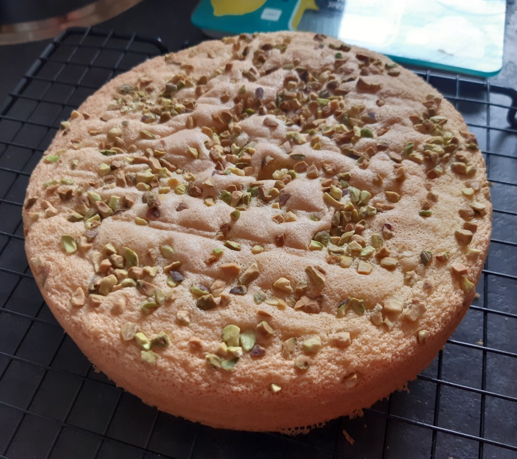 Pour la cuisson, soit vous faites cuire votre génoise dans un moule à manquer suffisamment haut de 18-20cm de diamètre ou réaliser 2 disques de génoise sur une plaque de cuisson. J’ai parsemé le dessus d’éclats de pistache mais c’est facultatif. Pour une génoise sur plaque, cuire environ 10min, pour une génoise dans un moule compter plutôt 20min… mais surveiller bien ça dépend des fours ! Pour savoir si elle est cuite, planter la lame d’un couteau dedans, elle doit ressortir sèche.