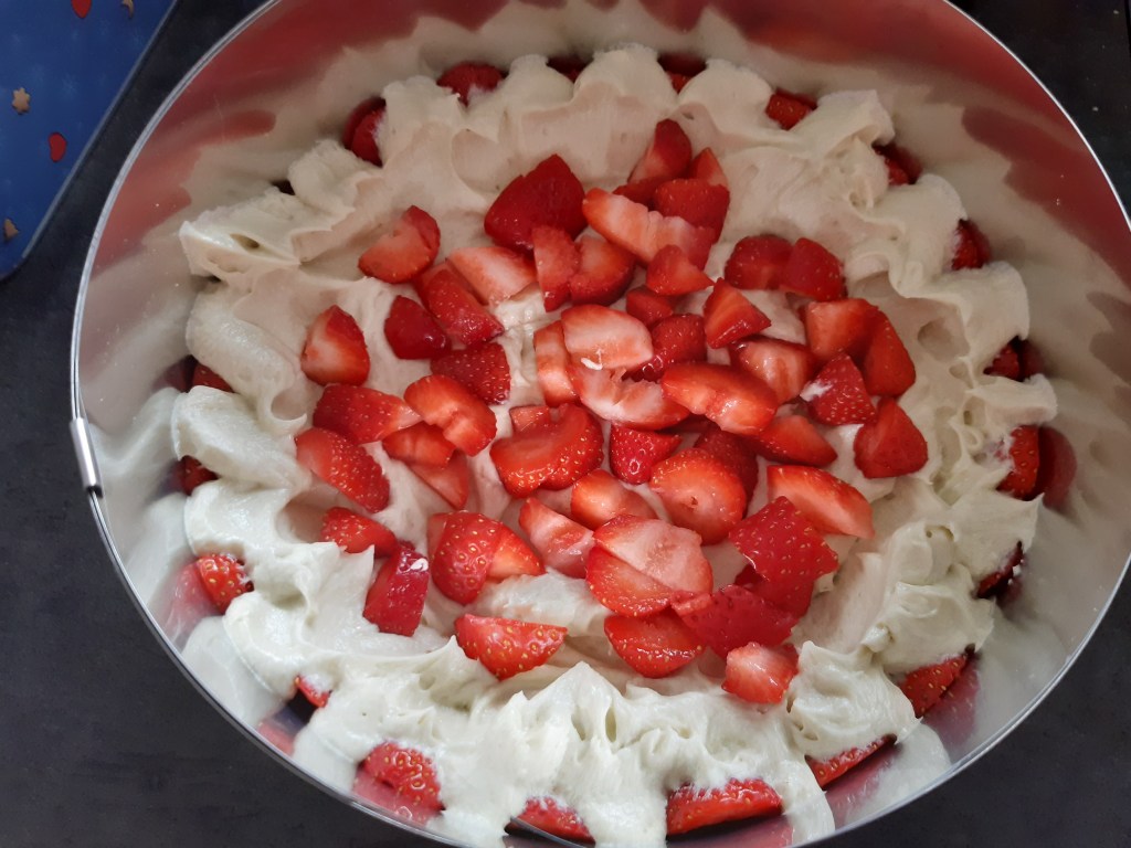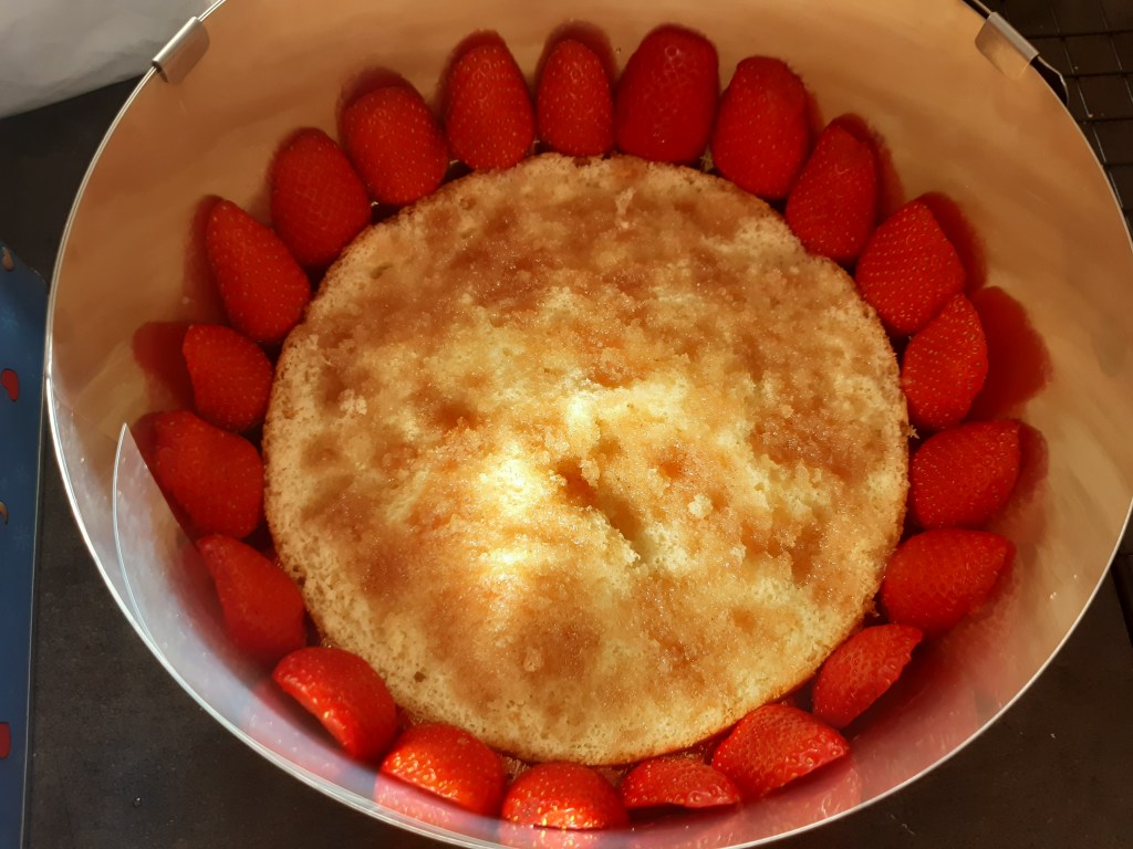 Dans un cercle à entremet, chemiser avec du ruban rhodoïd de la même hauteur que le cercle (ce qui n’est pas le cas sur la photo, mon cercle était déjà pris par un autre gâteau 🙂 ). Ca permettra un démoulage plus net de votre fraisier de mettre du rhodoïd. Ajouter des demi fraises tout autour du cercle puis ajouter le premier disque dans le fond (voir photo). Retailler le un peu si nécessaire.