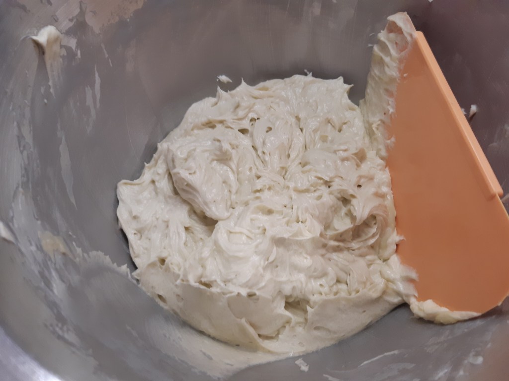 Lorsque la crème pâtissière est refroidie et que le reste de votre beurre est pommade (consistance d’une pommade), vous pouvez passer au montage de votre crème mousseline. Attention, beurre et crème doivent avoir à peu près la même température (20°). Dans la cuve de votre batteur, fouetter la crème pâtissière pour l’assouplir puis progressivement ajouter le beurre pommade ! Fouetter assez énergiquement pour que la crème monte et s’homogénéise. Elle est prête quand elle est bien lisse et qu’elle se tient bien (voir photo).