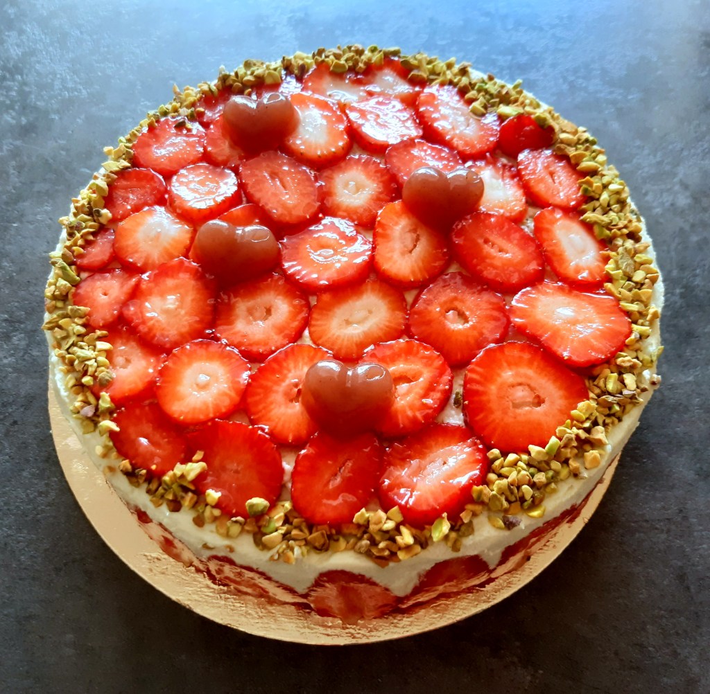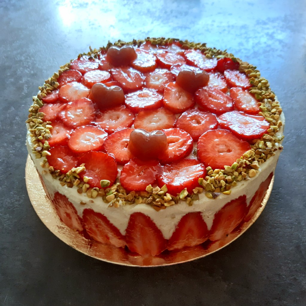 Pour le décor, j’ai choisi de recouvrir le dessus de rondelles de fraises et de mettre des éclats de pistache sur le pourtour. Les petits coeurs sont de la purée de fraise gélifiée. J’ai également napper mes fruits avec un nappage pour les rendre plus brillants et les protéger.
