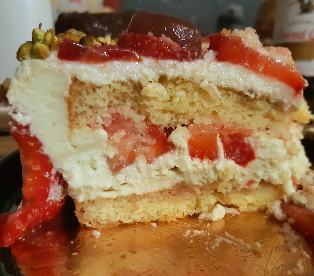 Ajouter votre crème pistache (ne pas tout mettre, il en faut aussi pour le dessus !) sur le disque de génoise et entre les fraises (voir photo). Ajouter des fraises coupées sur votre crème mousseline pour un gâteau riche en fruits.