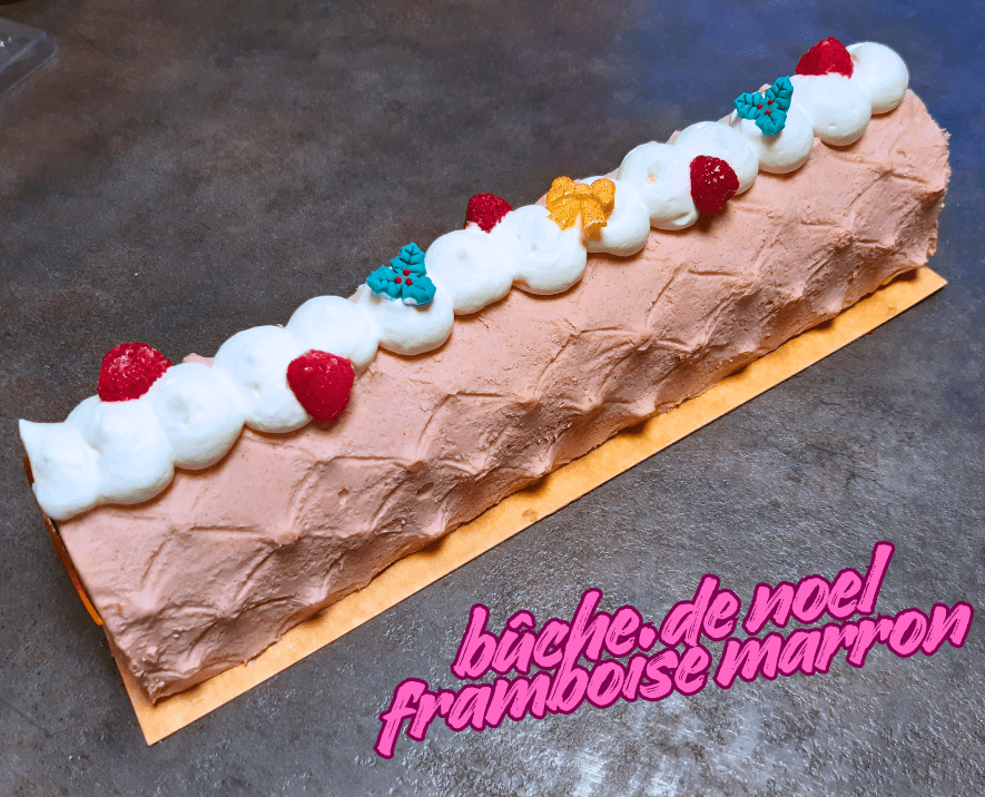 Première bûche que j’ai réalisé cette année 🙂 Elle est composée d’un biscuit joconde, d’un croustillant chocolat au lait, d’une mousse framboise et d’un crémeux marron. Mes proches ont plutôt bien apprécié sa douceur et sa légèreté !
